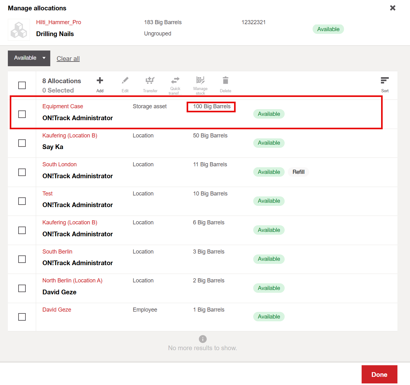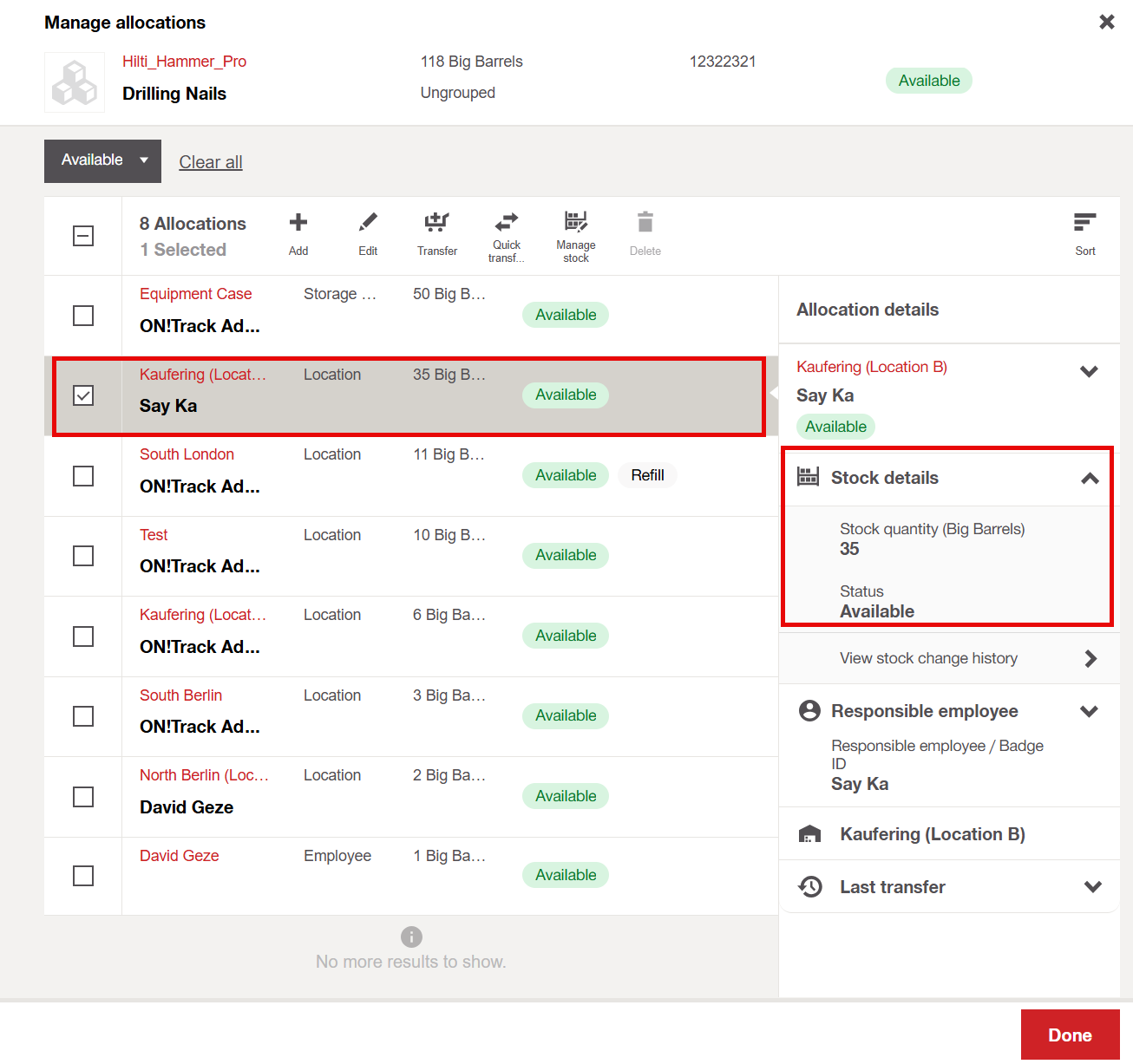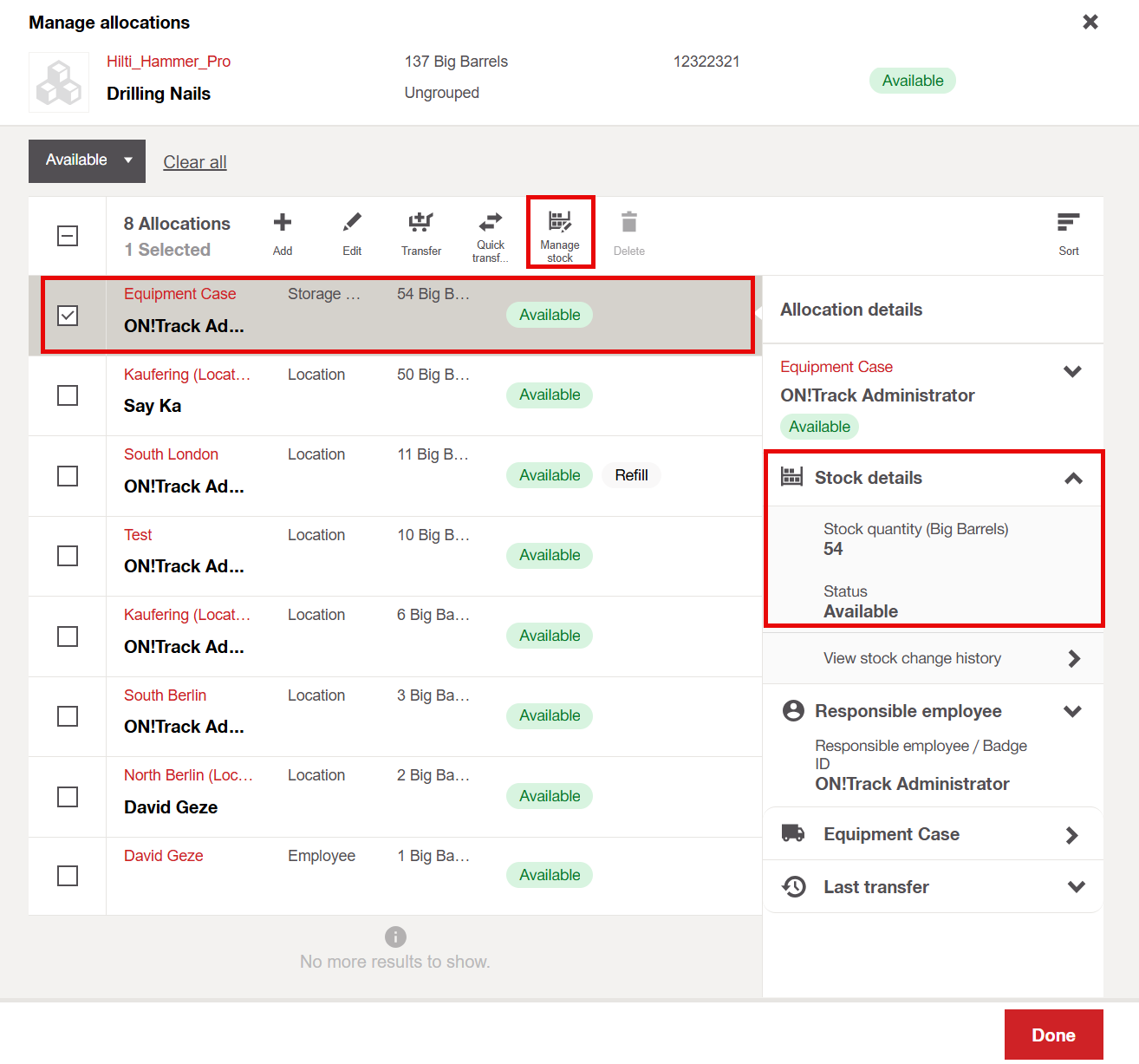 - Open the allocation tab, select the allocation you want to update and click on the "Manage Stock".