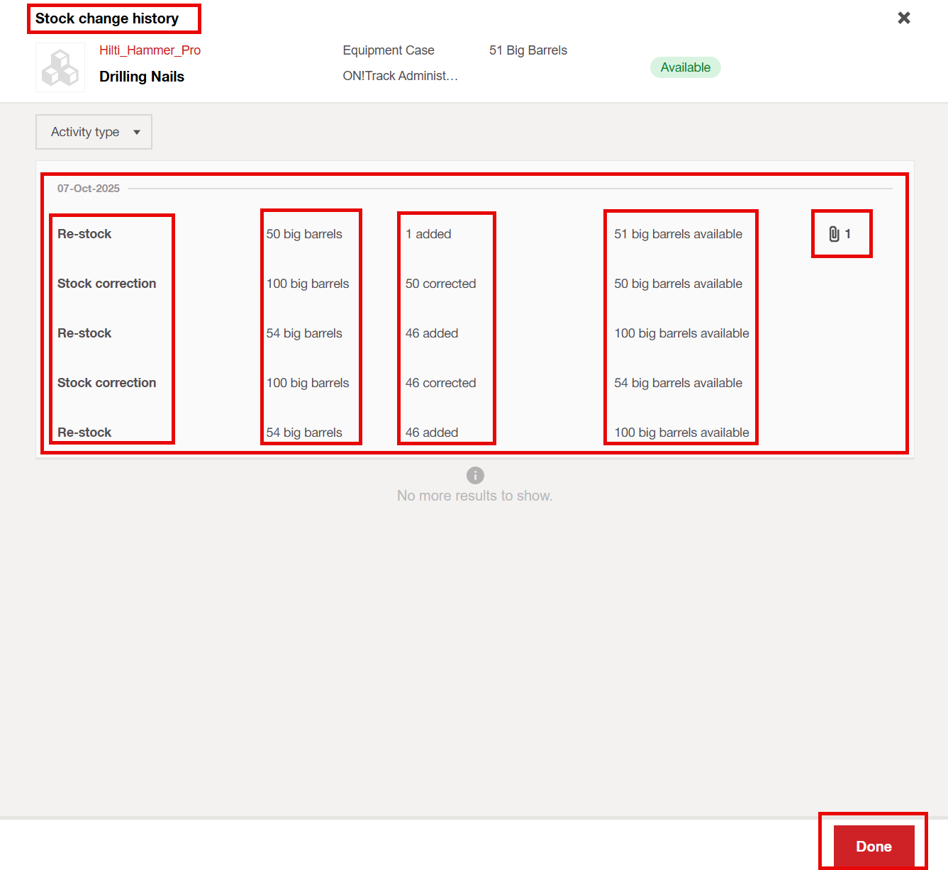 - On this page, you will see various columns such as: Activity Type, Original Quantity, Corrected Quantity, Final Quantity, Attachments.