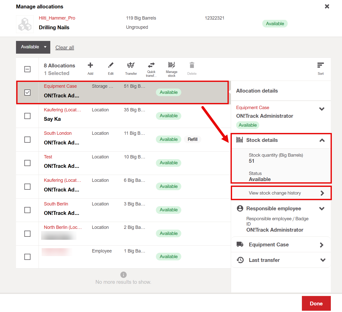 - Open the allocation tab and pick the allocation you want. In the allocation details slider, click View Stock Change History.