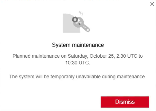 The above notification is available after the successful login and will be deactivated once the scheduled maintenance is completed.