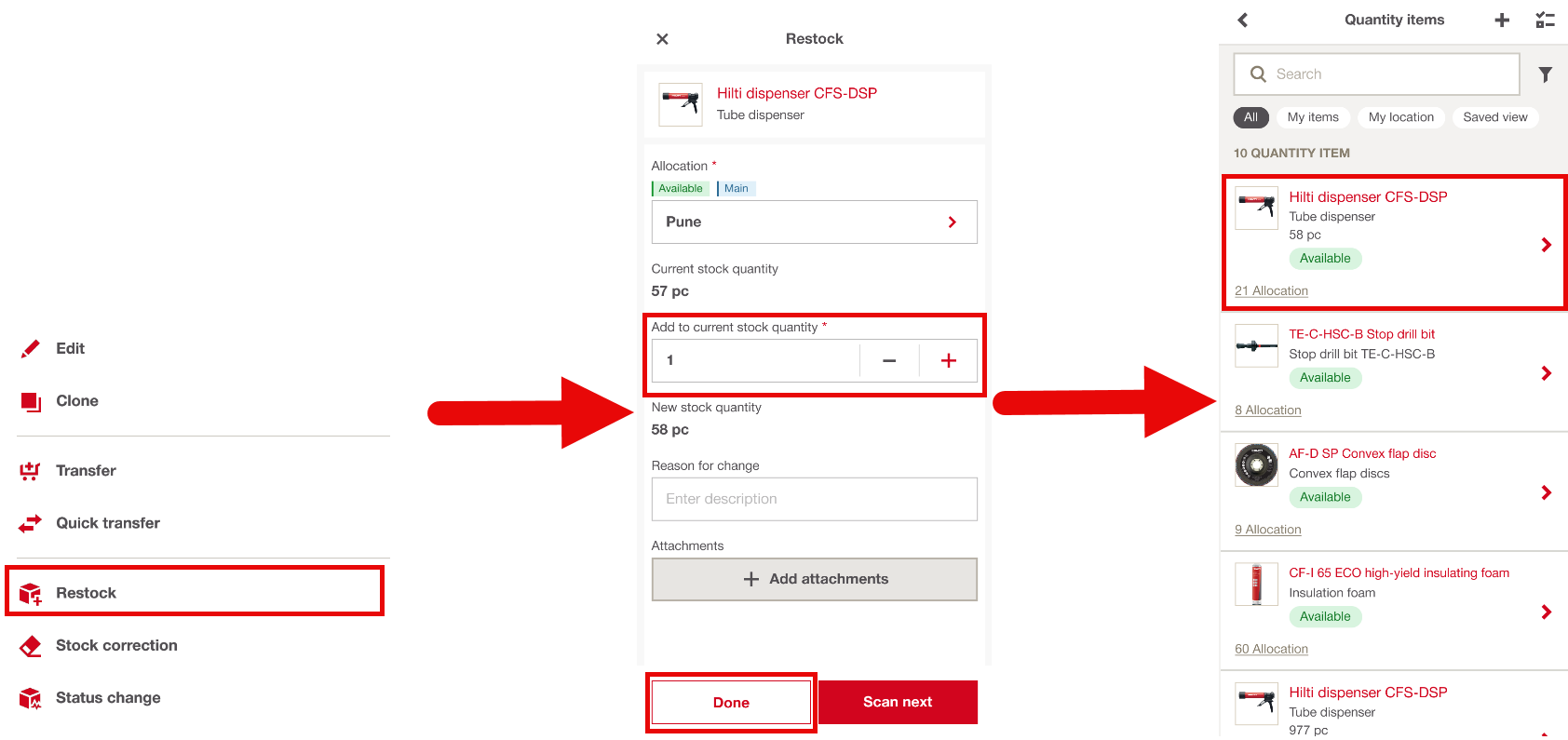 - Select a flow: Restock, Stock Correction, or Status Change (For this article, we’ll focus on the Restock option) and tap done.