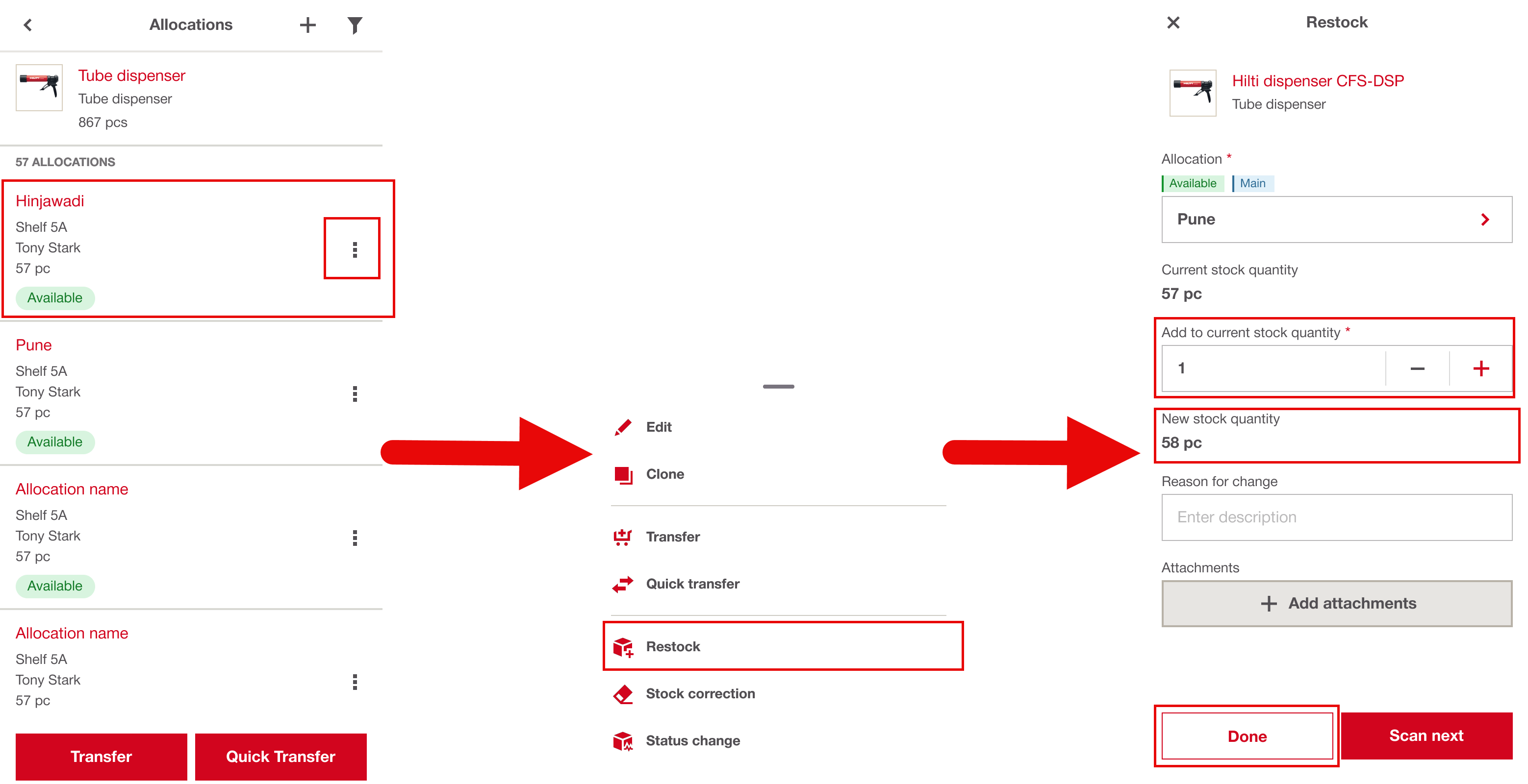 - Select a flowby clicking on more: Restock, Stock Correction, or Status Change (For this article, we’ll focus on the Restock option) and tap done.