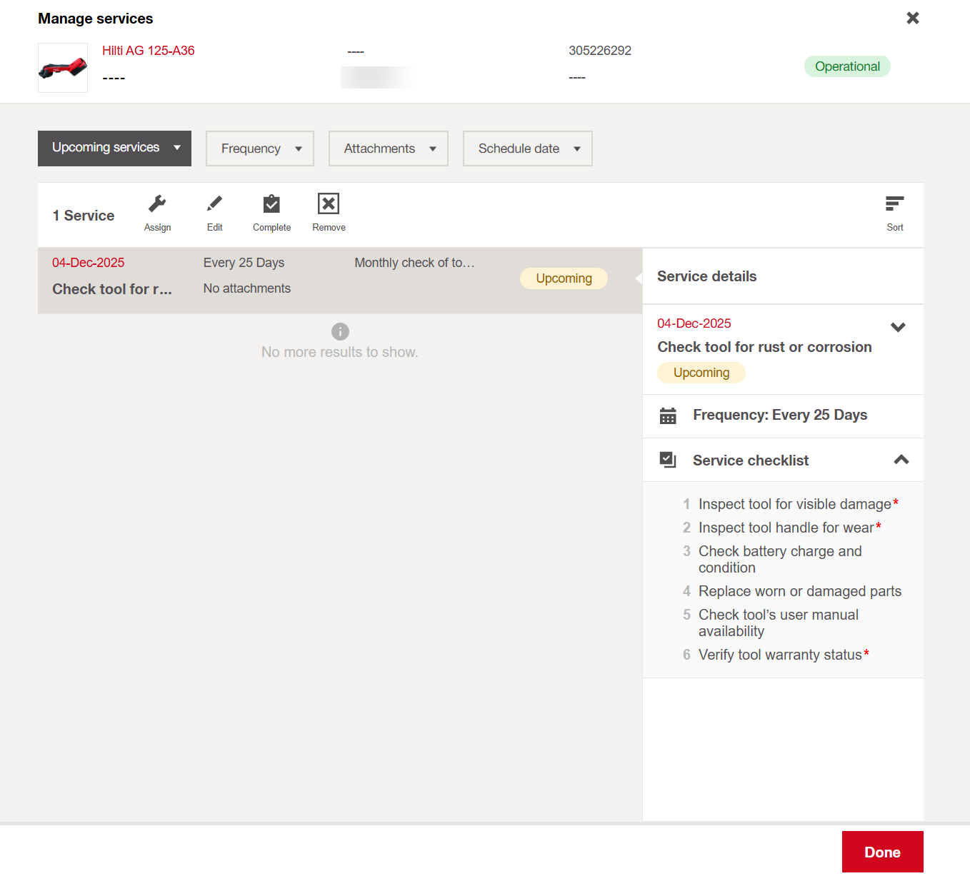 Go to the "Assets" section, select the required asset, and click on upcoming services to view the details in the details panel.