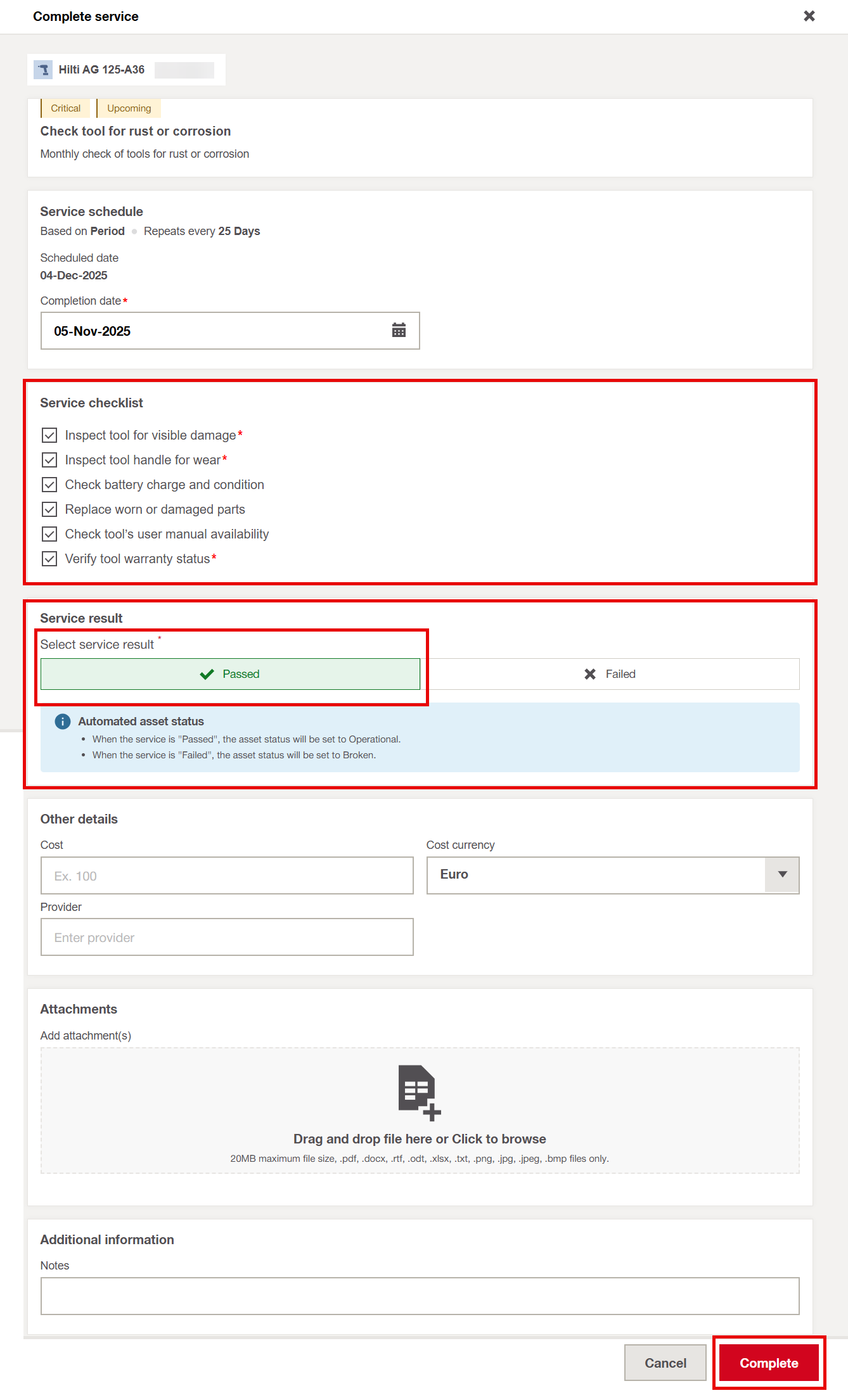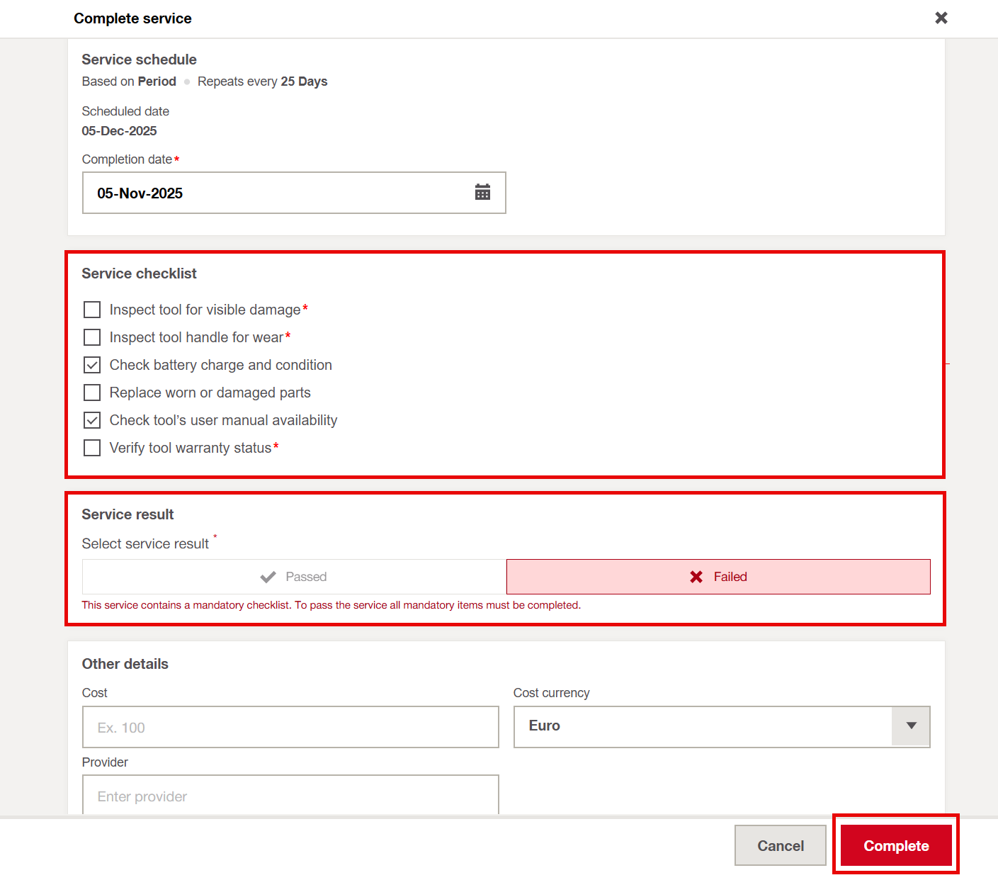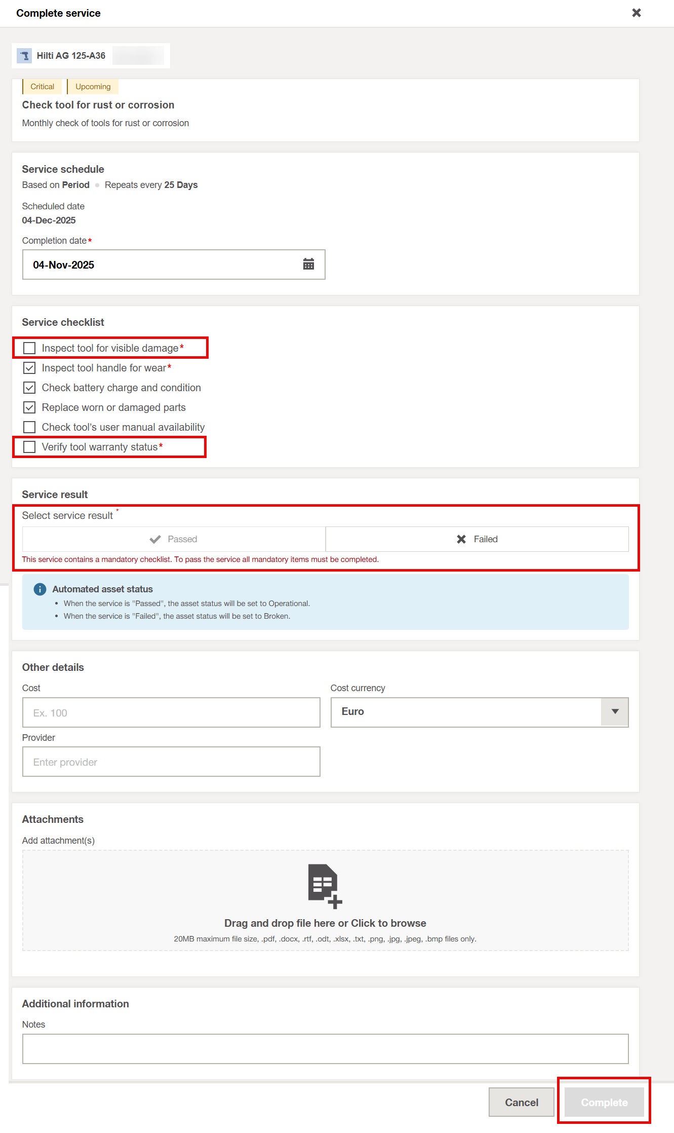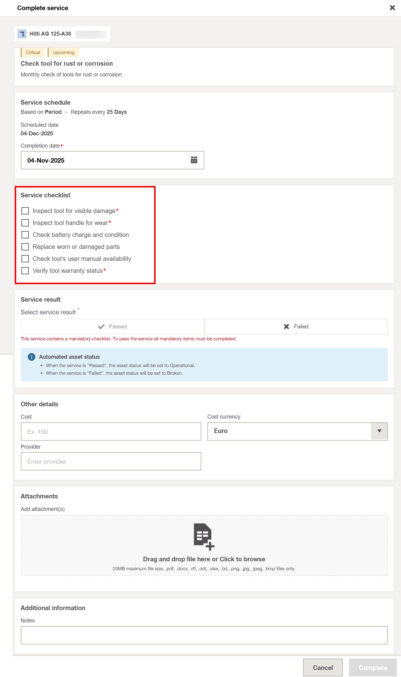 Finish all mandatory checklist items first. Then choose Passed or Failed. After that, the ‘Complete Service’ button will be enabled.