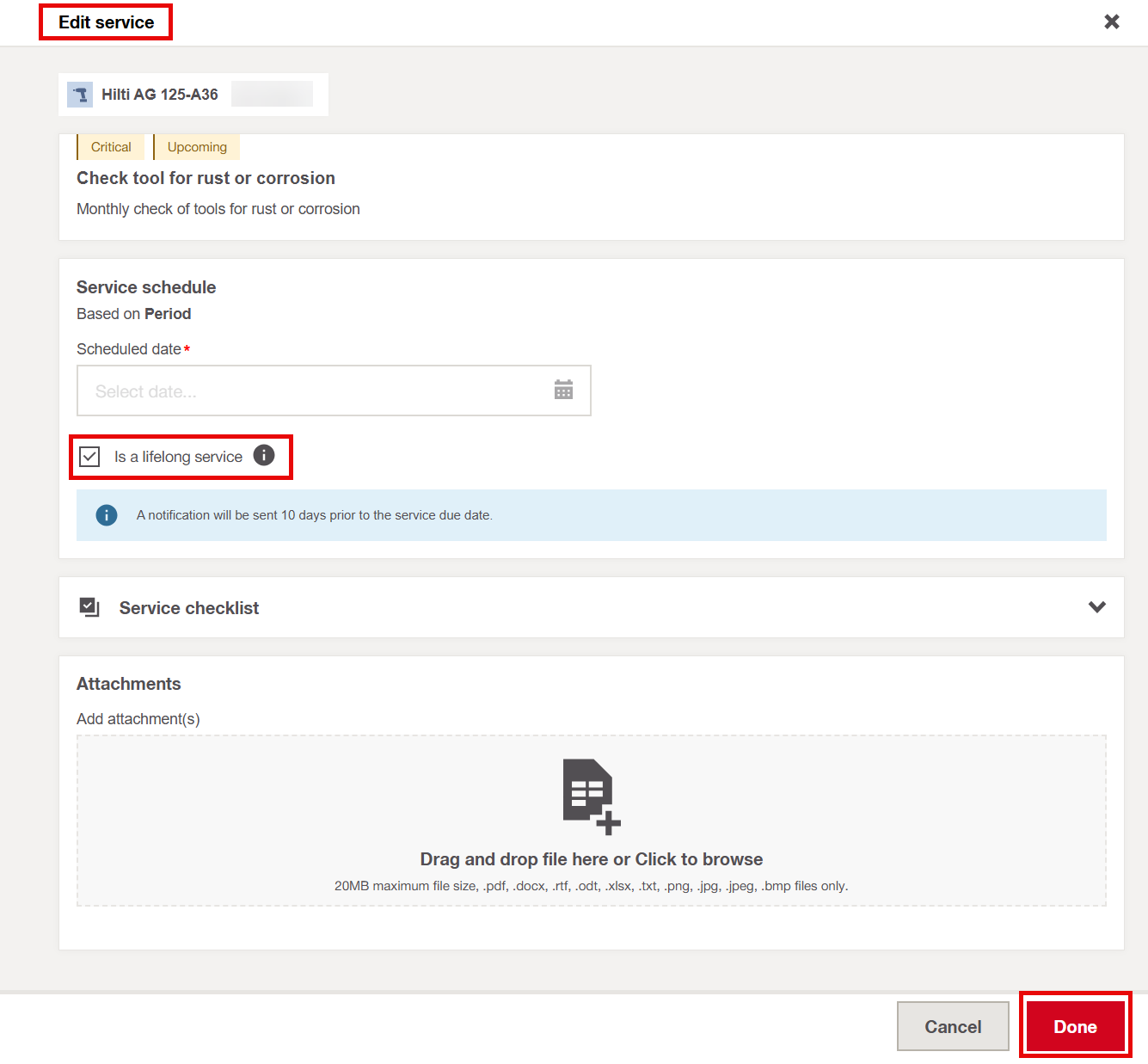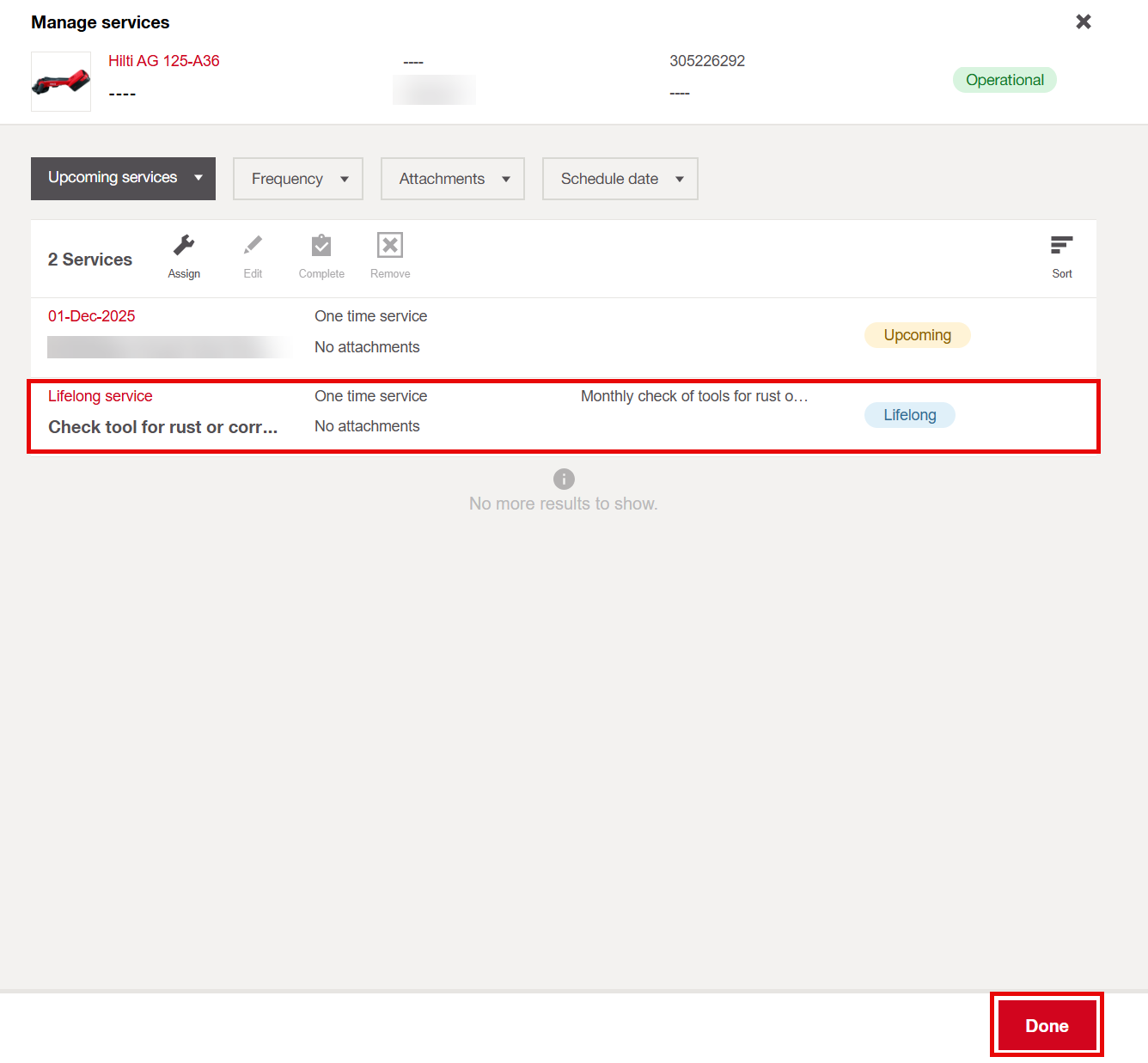 - Assigning a Lifelong Service: You can assign a one-time service to an asset and later change it to a lifelong service.