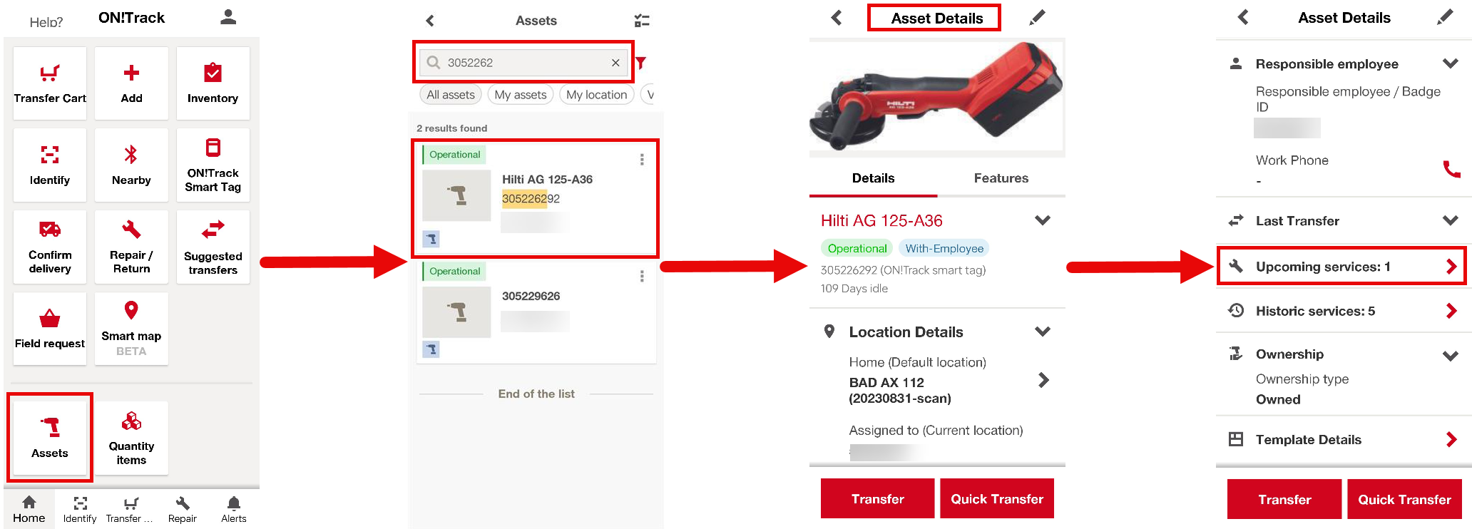 - Go to the "Assets" section, select the required asset, and click on upcoming services to view the details in the details panel.