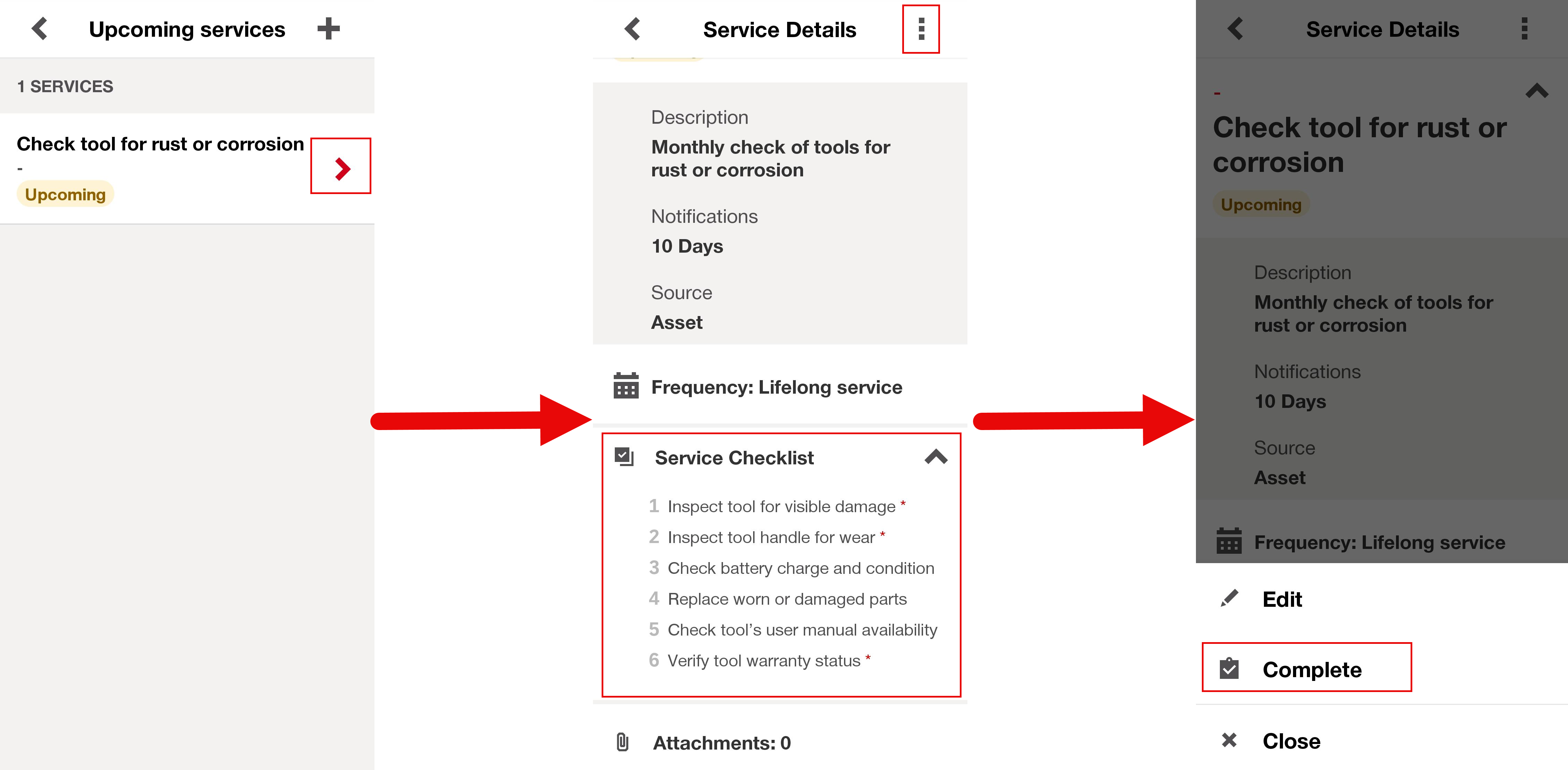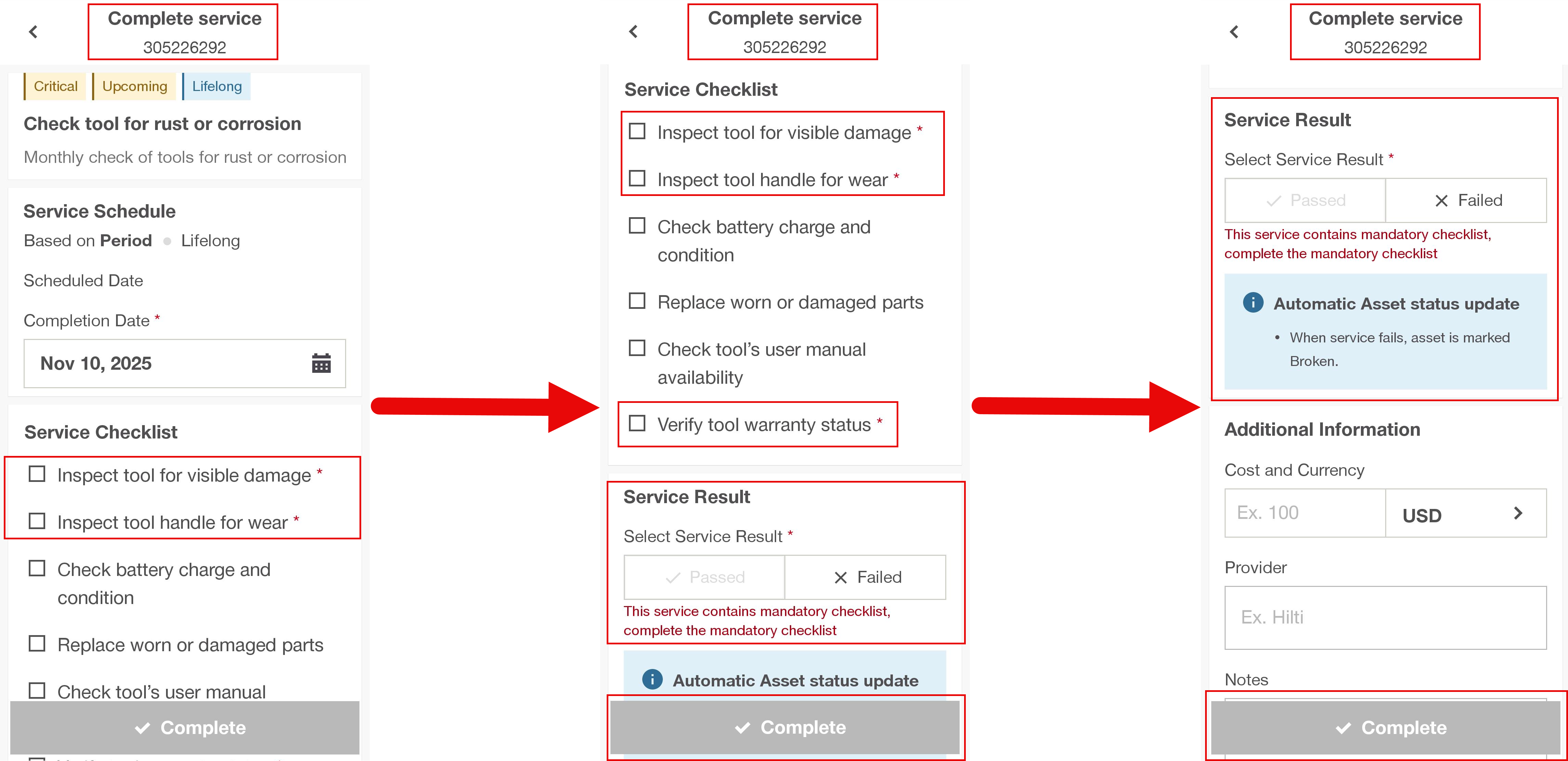 Service completion through a checklist ensures that tasks are completed in the correct sequence, properly documented, and tracked for maximum transparency.