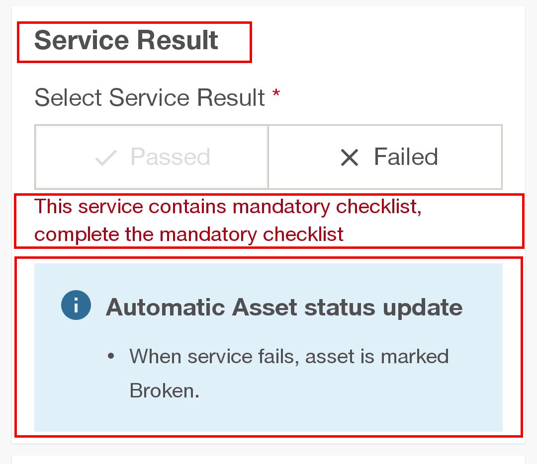 - You must complete all mandatory checklist items before you can mark the service as "Passed". Once all mandatory items are completed and the service result is marked, the "Complete" button will become enabled.