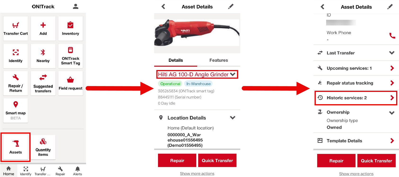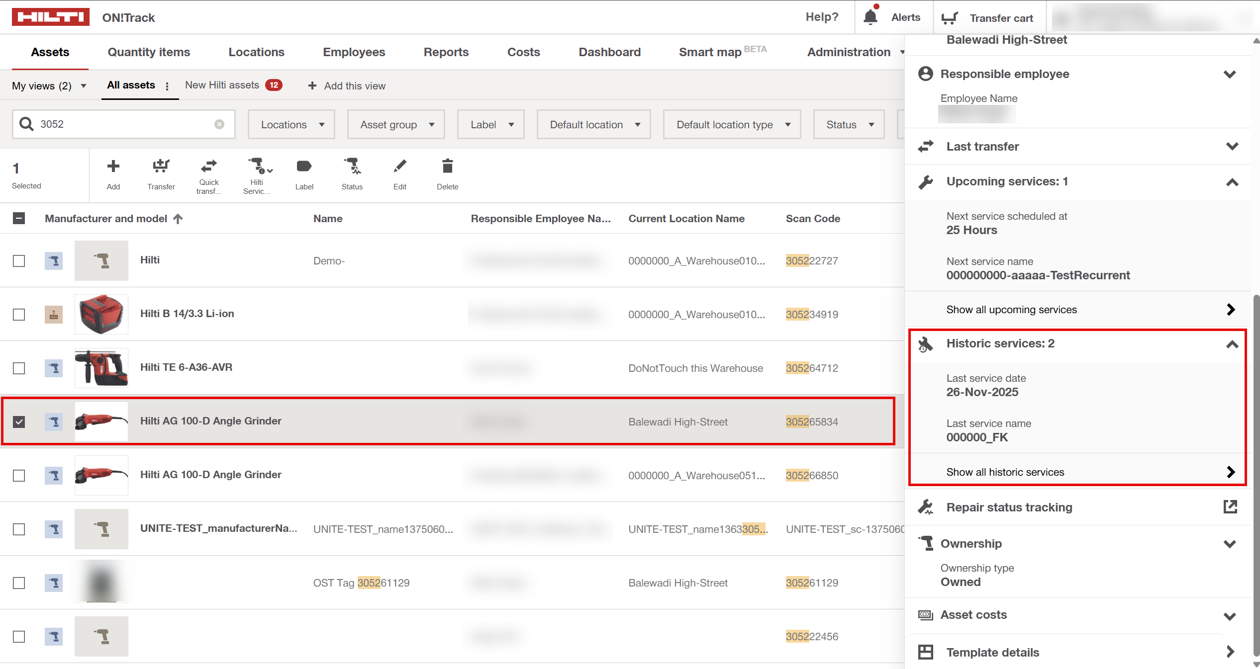- Search for the asset you need, select it, and click on “Show all historic services".