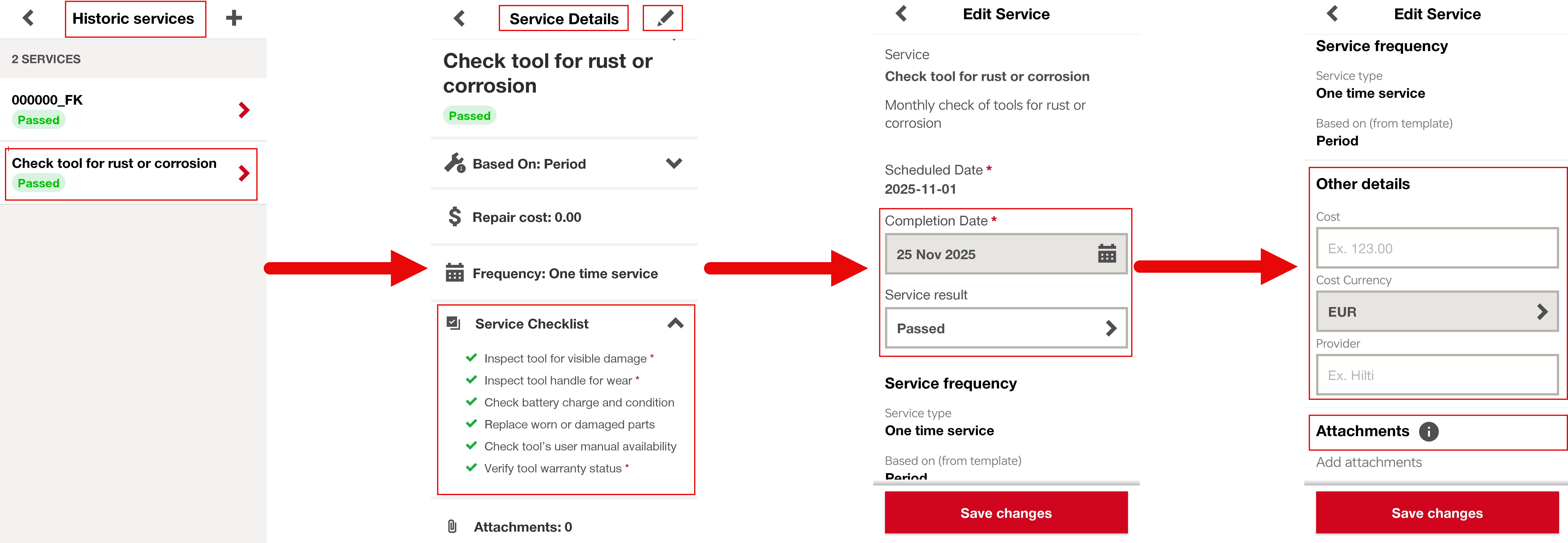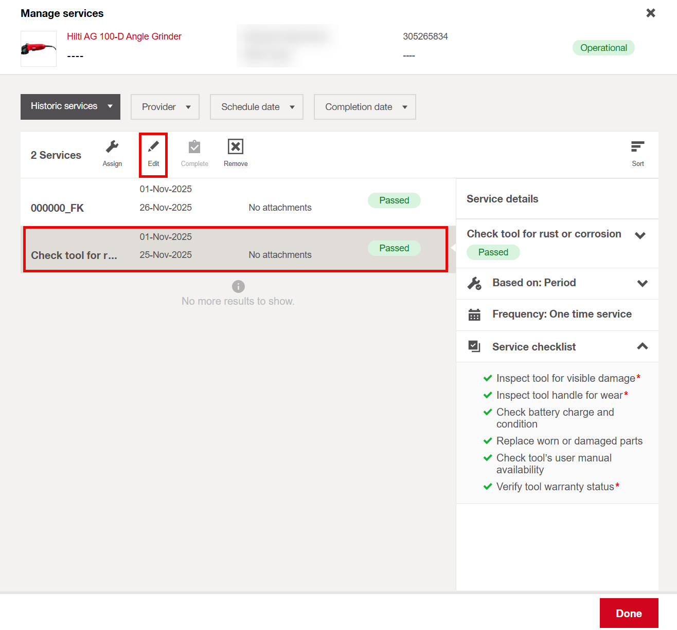 - You can edit the completion date, service result (if all mandatory items are checked), other details, attachments, and additional information.