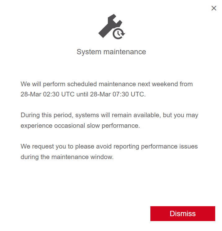The above notification is available after the successful login and will be deactivated once the scheduled maintenance is completed.