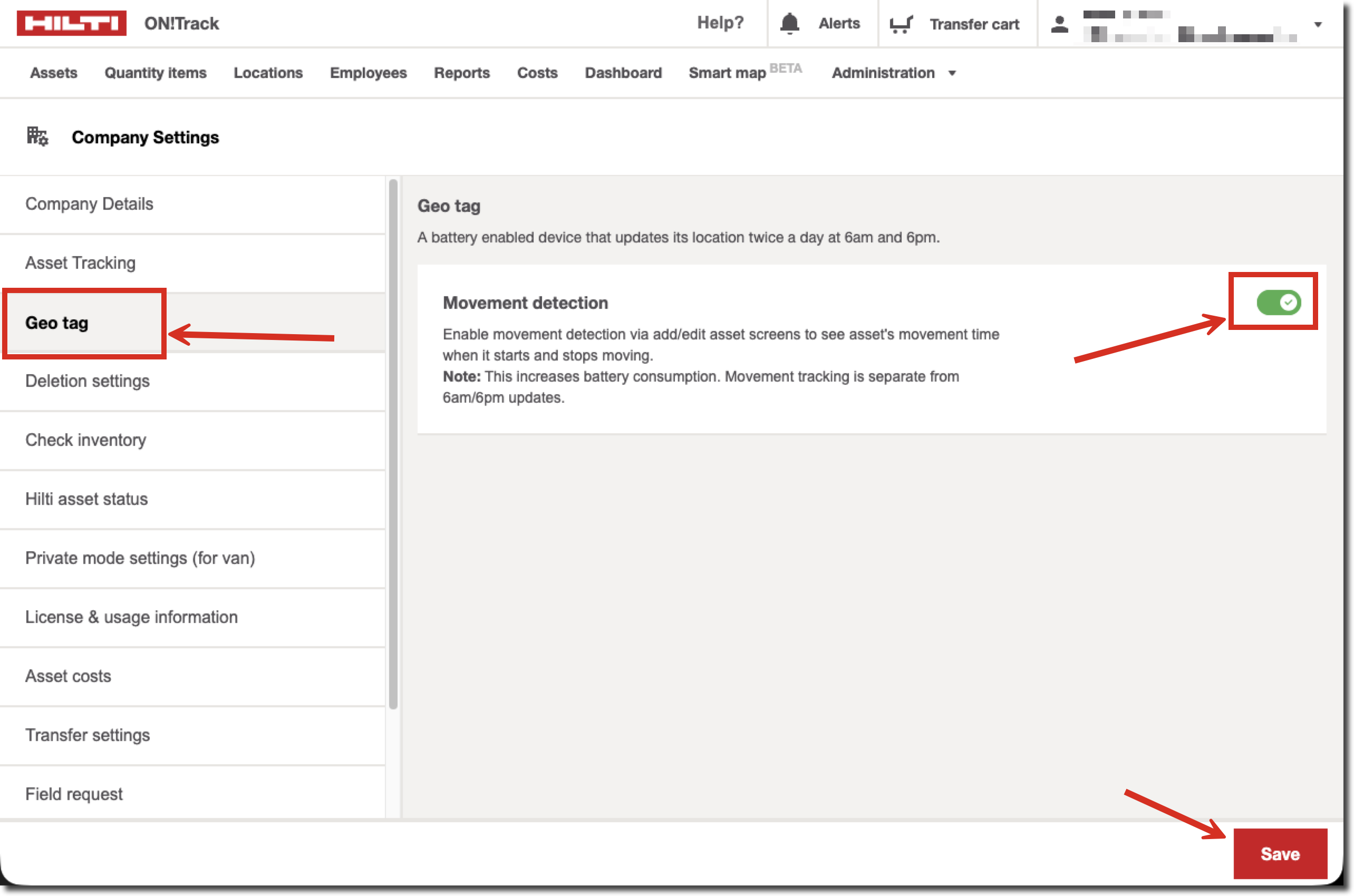 Geo Tag movement detection is controlled by a tenant‑level master switch. Before the feature can be used, it must first be enabled by an Admin user in your ON!Track tenant.